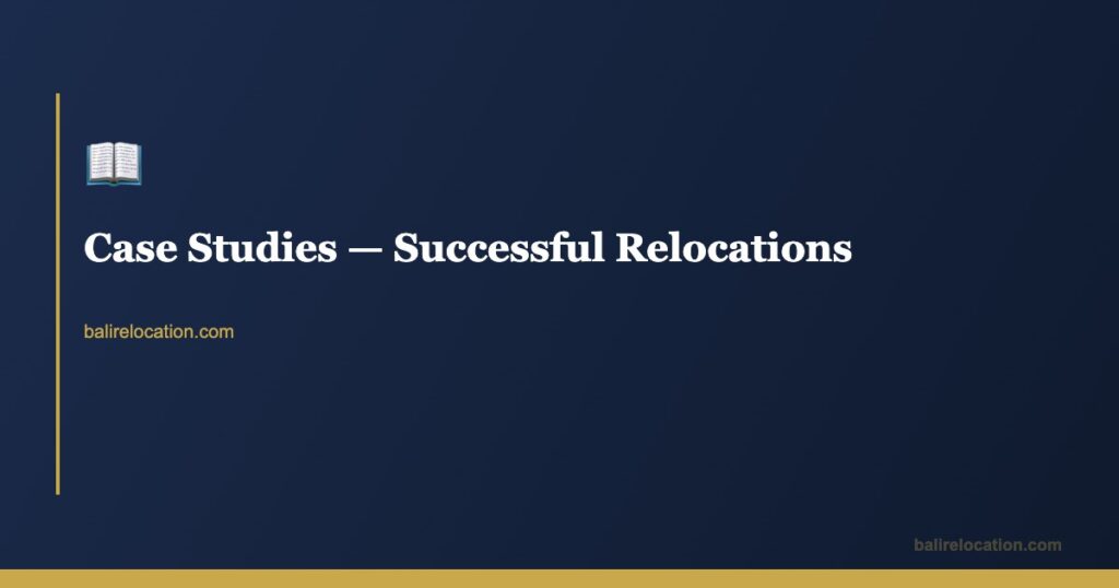 Bali Relocation has guided hundreds of successful relocations across diverse client profiles. Examples include Australian families securing school placements and family villas within 3 weeks, British retirees obtaining retirement KITAP visas with full healthcare and property setup, American entrepreneurs establishing PT PMA companies and launching businesses within 2 months, and Dutch digital nomads transitioning from tourist visas to long-term residency with coworking-friendly housing.